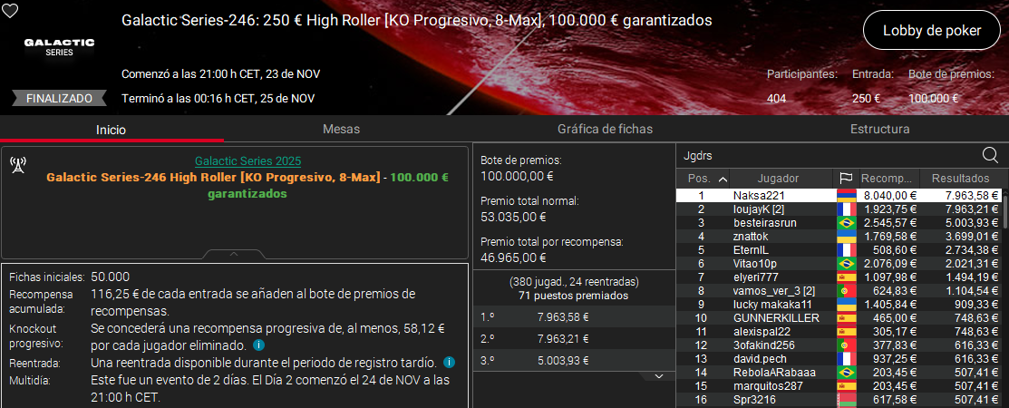 El armenio Naksa221 se impuso a los 404 participantes para llevarse un premio de 16.003 € tras vencer en el HU al francés loujayK.
