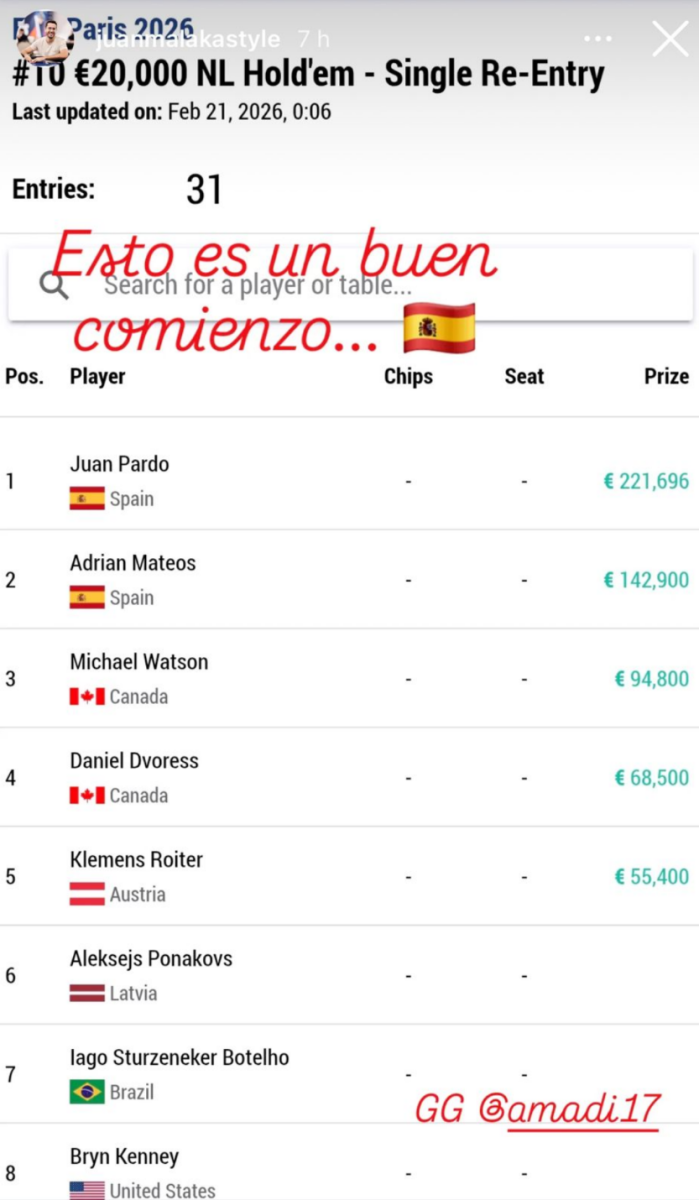 El EPT París 2026 ya ha dejado la primera gran noticia para el poker español. El €20k NLH High Roller terminó con un duelo fratricida entre Juan Pardo y Adrián Mateos demostrando una vez más que España tiene mucho que decir en la élite del poker mundial.