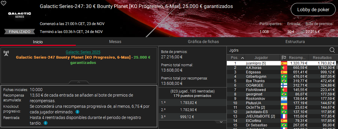 A estos dos resultados hay que sumar el conseguido por canalla888 en el Galactic Series-243: 20€ The Classic. El español se llevó un premio de 4.148 € gracias a un runner-up en este torneo de 3.627 participantes y 65.286 € de prize pool.