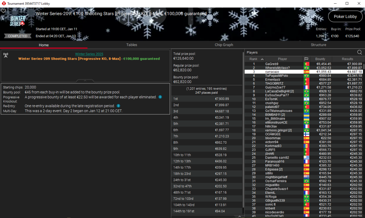 Y para terminar, el €100 Shooting Stars PKO 8-Max otro de los torneos más grandes de la jornada. Aquí, además, España se vio rodeada de gente con acento portugués. Tres lusos y cuatro brasileños debían impedir que curracazo pusiera la bandera española en lo más alto del torneo. El español alcanzó el tercer puesto y sumó 5.744 €.