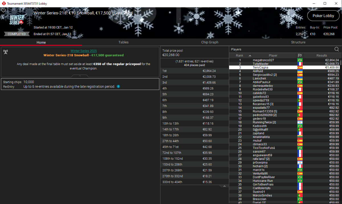 En el €10 Snowball 8-Maxtuvo más de 2.250 participantes y tres españoles pisaron la mesa final. TerryCagna alcanzó el podio y terminó tercero por 1.410 €, SergioCastillo2 fue quinto por 694 € y damequetedoy finalizó octavo por 240 €.