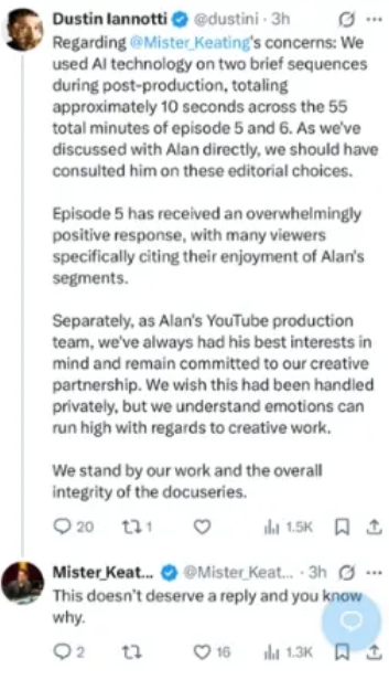 “Utilizamos IA en dos secuencias breves durante la postproducción, sumando aproximadamente 10 segundos dentro de los 55 minutos totales de los episodios 5 y 6. Tal y como ya hemos hablado directamente con Alan, deberíamos haberle consultado sobre estas decisiones editoriales.” Iannotti añadió que los episodios de Keating habían recibido “una respuesta abrumadoramente positiva”, con muchos espectadores destacando específicamente lo mucho que habían disfrutado de los segmentos de Alan: “Respaldamos nuestro trabajo y la integridad general de la docuserie”.