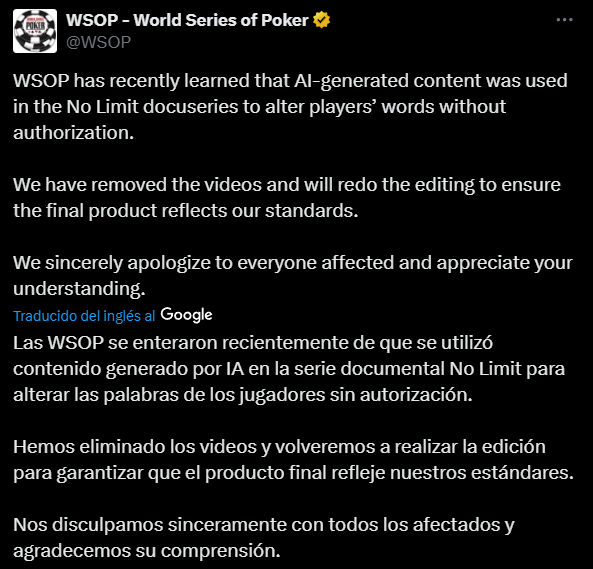 La polémica ha estallado en la comunidad del poker internacional después de que las WSOP confirmaran que la docuserie No Limit incluía contenido generado con inteligencia artificial para alterar declaraciones de varios jugadores sin su autorización. El organismo reaccionó de inmediato retirando los seis episodios publicados en su canal de YouTube y anunciando una reedición completa del proyecto.