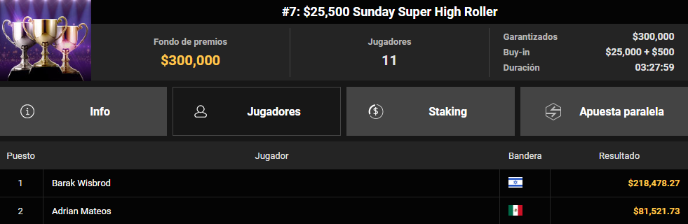 El fogonazo más grande del fin de semana llegó en el $25.500 Super High Roller, donde Amadi se quedó a un solo paso del título, cerrando el torneo con un segundo puesto. El torneo apenas contó con 11 jugadores y solo los dos primeros se repartirían los 300.000 $ que se garantizaban.