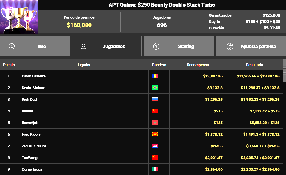 Su tercer puesto se tradujo en $12.276 y estuvo acompañado en la FT por Ka Kwan Lau, quien fue sexto y ayudó a superar los 200.000 $ en premios totales aportando 4.826 $.