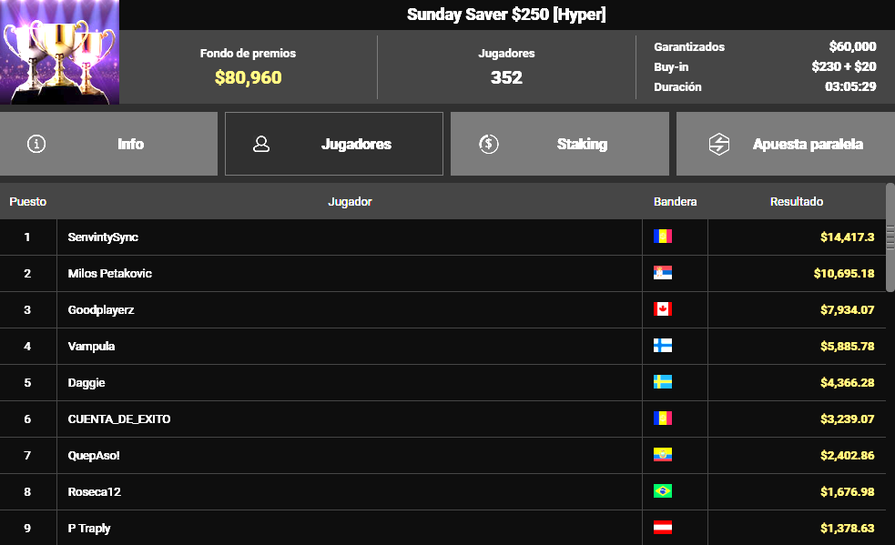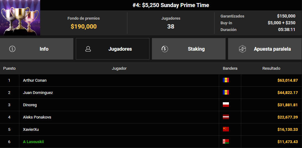 El segundo mejor resultado del fin de semana fue para Malaka, que firmó otro subcampeonato en el Sunday Prime Time $5.250. El malagueño se tuvo que ver las caras contra algunos de los mejores jugadores del mundo en un field de 38 jugadores y pudo alcanzar los seis puestos premiados.
