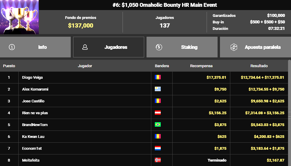 El tercer mayor premio de este bloque lo firmó César García, que volvió a lucirse en su terreno favorito: el Pot Limit Omaha. Se llevó el Omaholic Super Stack HR $840 por $13.170, en una mesa final donde manejó los tiempos a su antojo hasta llegar al heads-up, donde pactó con "Sh0wMeTh3Money", quien se llevó 13.003 $.