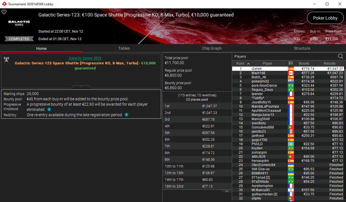 El primero en alzar su estandarte fue iZeNiiK en el GS-123: €100 Space Shuttle [PKO, 8-Max, Turbo], un evento de 130 registros que dejó un prize pool de €11.700. Su premio final fue de €1.827 entre los €1.047 de premio regular y los €780 en bounties.