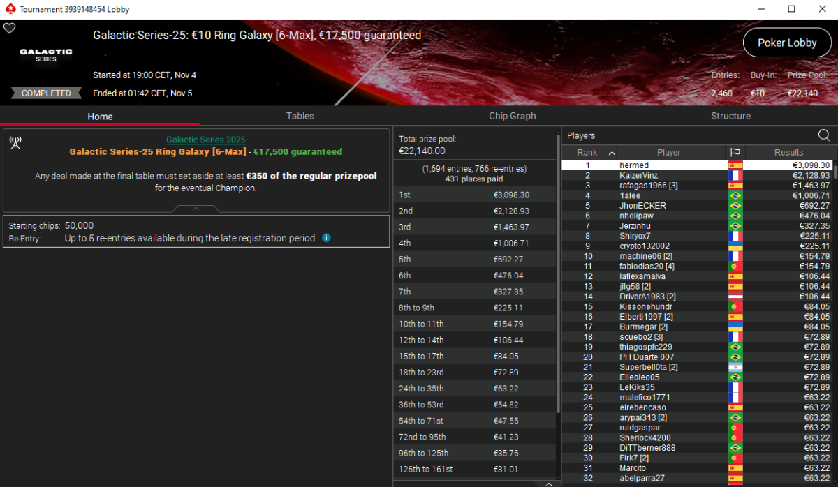 El primero en dejar su huella fue hermed, que conquistó el Galactic Series-25: €10 Ring Galaxy [6-Max] tras imponerse a un field de 2.460 jugadores. Su victoria le reportó €3.098, imponiéndose en un intenso heads-up al francés KaizerVinz.