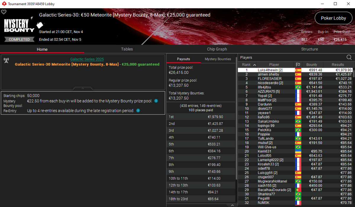 En el Galactic Series-30: €50 Meteorite [Mystery Bounty, 8-Max], Luks4thewin también llevó la bandera española a lo más alto tras imponerse entre 587 entradas y sumar un premio total de 2.971 €, incluidos 991 € en recompensas Mystery.