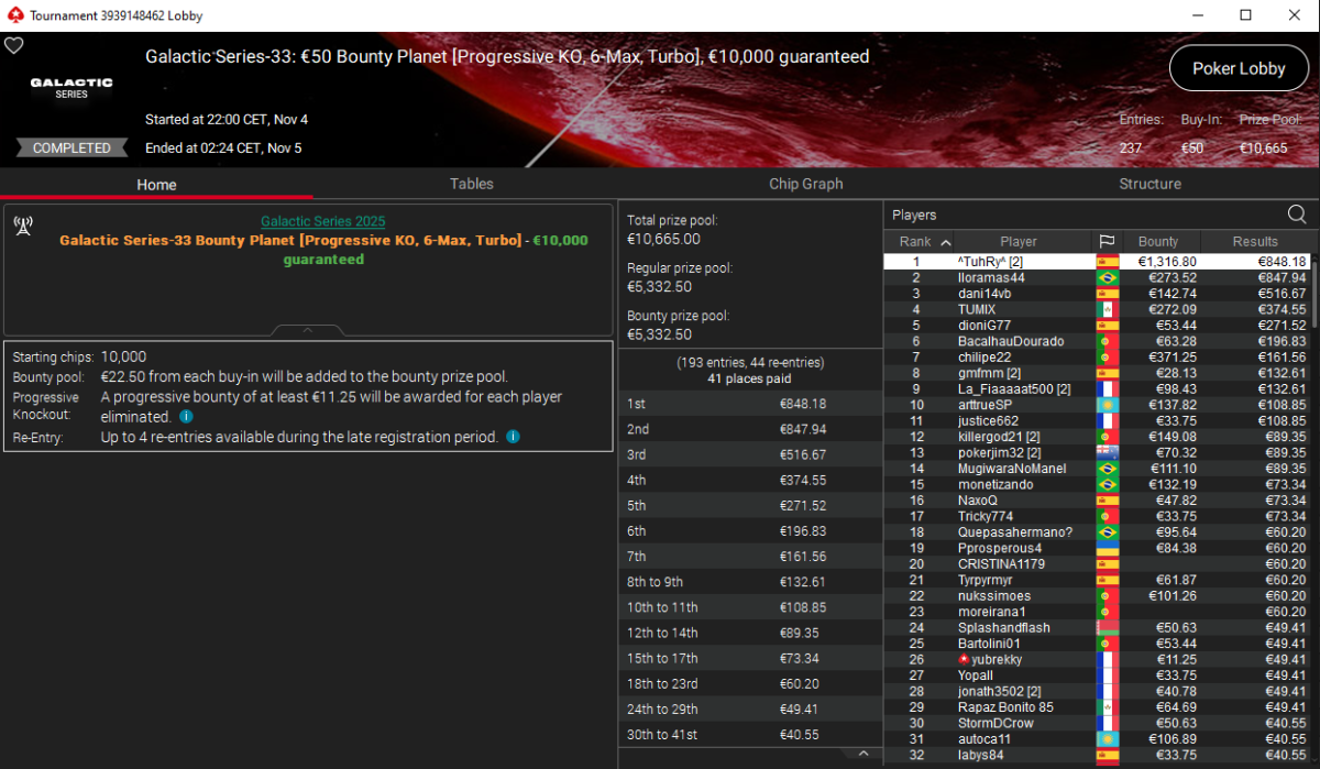 Por su parte, ^TuRhY^ brilló en el €50 Bounty Planet [6-Max, Turbo], venciendo a 237 rivales y sumando 2.165 € entre el premio y los más de 1.300 € en recompensas, además de llevarse el título.