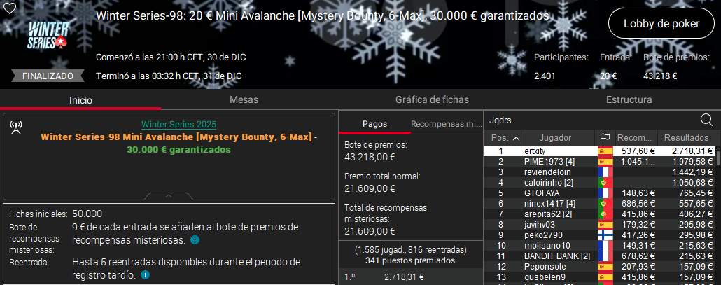 Ayer se disputó la última jornada del año de las Winter Series de PokerStars, una última batalla de 2025 que nos dejó cuatro victorias españolas.