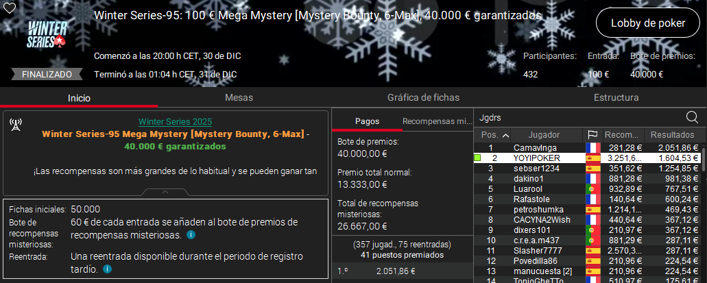 En cualquier caso, hubo un jugador que le superó a todos en lo que a dinero se refiere. YOYIPOKER fue uno de los 432 jugadores que disputaron ayer el Mega Mystery de 100 € de entrada y gracias a acumular 3.251 € en Mystery Bounties y 1.604 € por su segunda posición, sumó un total de 4.855 €.