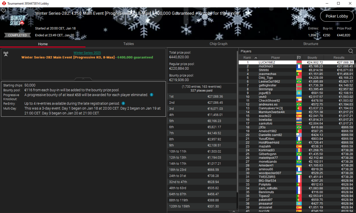 El Main Event de las Winter Series cerró el telón por todo lo alto con 1.896 entradas y un prize pool de 440.820 €. En esa noche de cuchillos largos y afilados en busca de cazar bounties, LUCKYMEZ fue el gran protagonista cazando el mayor premio del torneo: 27.088 € de premio + 24.903 € en recompensas para un total de 51.991 €.