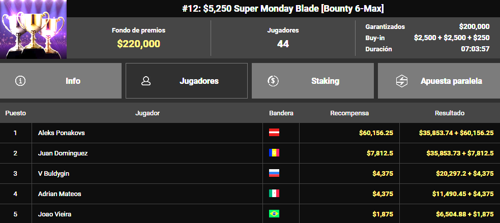 La primera bala del día, el $5.250 Super Monday Blade, reunió a 44 jugadores dispuestos a pelear por los 220.000 $ del prize pool. De todos ellos, solo cinco pasarían por caja, asegurando un cobro mínimo de 6.505 $. Hasta ahí llegaron tres caras muy conocidas por todos: Malaka, Amadi y Joao Vieira.