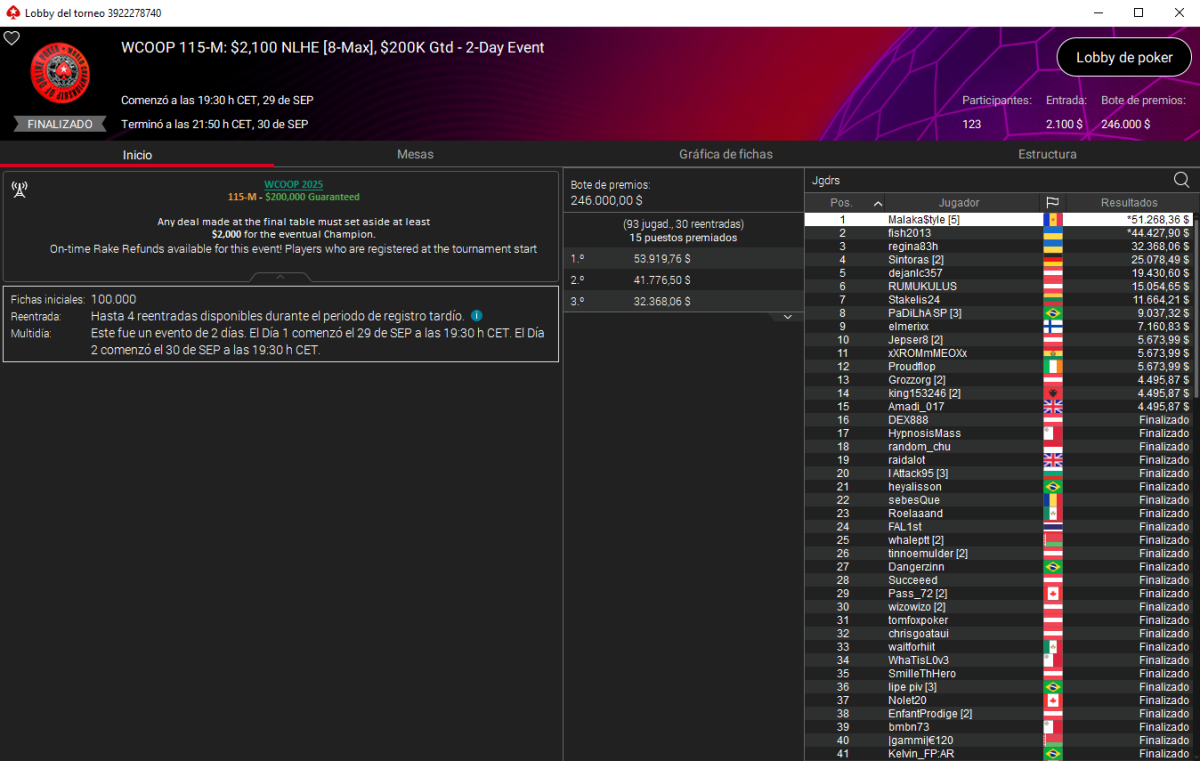 Malaka gana su segundo título de las WCOOP 2025 por 51.268 $