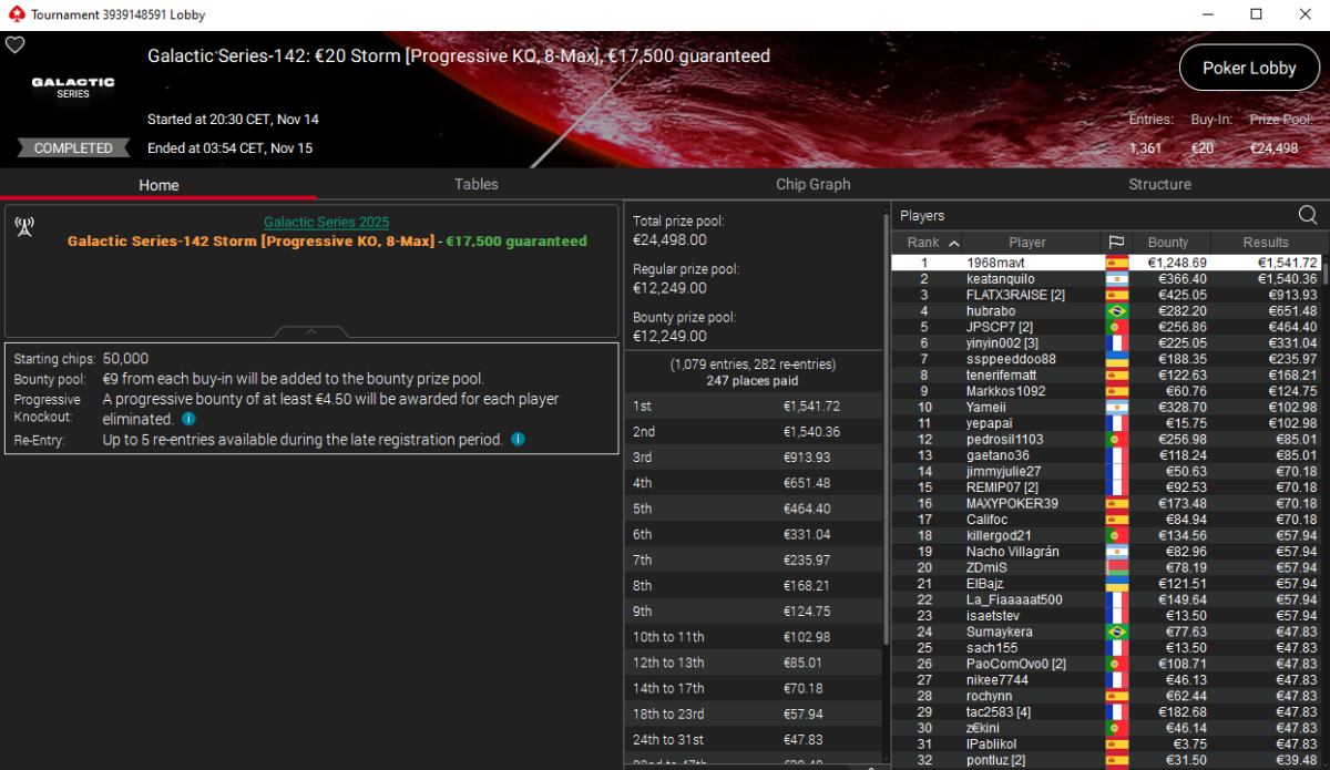 1968mavt abrió fuego en el GS-142 Storm €20. El primer español que se proclamó campeón aterrizó en tierra con un botín de 2.790 €, 1.542 € de premio y 1.249 € en bounties tras una cacería precisa.