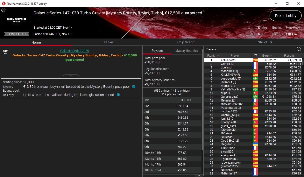 La lista siguió creciendo cuando antuanet11 venció el GS-147 Turbo Gravity €30 Mystery, reclamando 1.340 € + 662 €, completando un botín de 2.002 €.