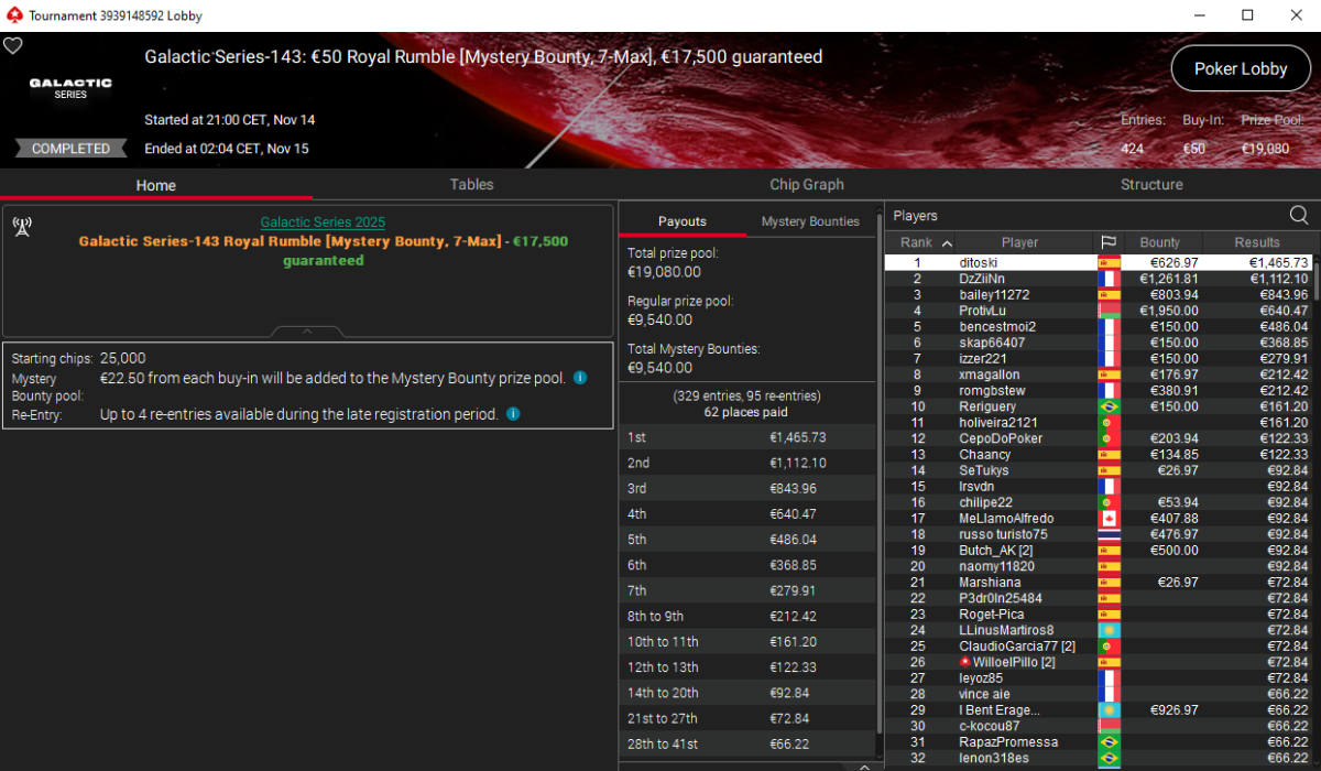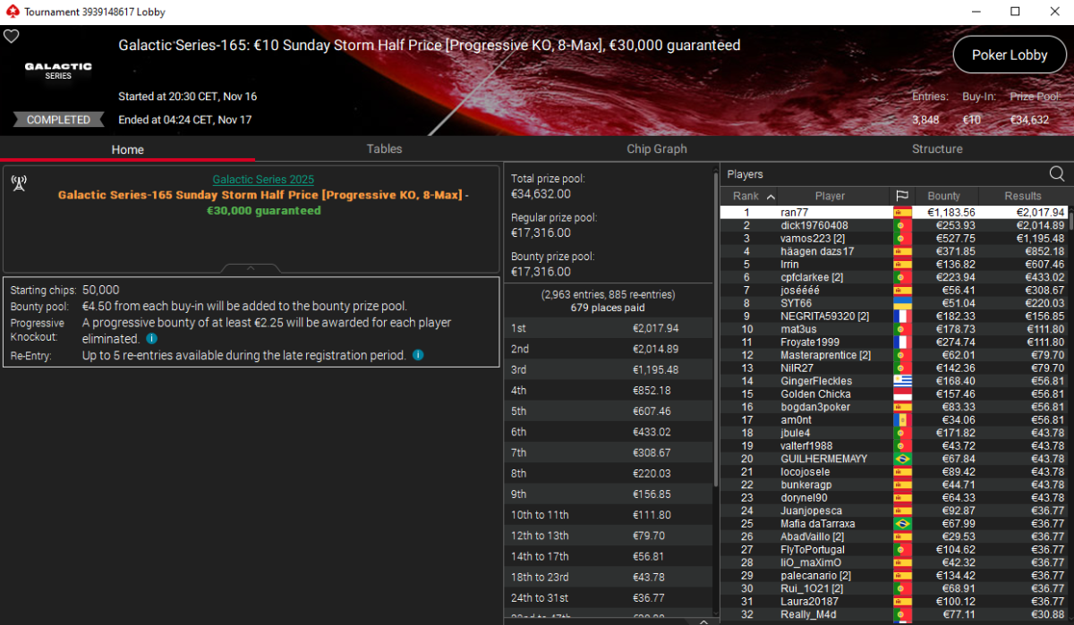 ran77, por su parte, se adjudicó el GS-165 Sunday Storm Half Price €10, con 2.018 € + 1.184 € de premio, aterrizando con 3.202 € en sus manos, una de las hazañas más rentables del domingo.