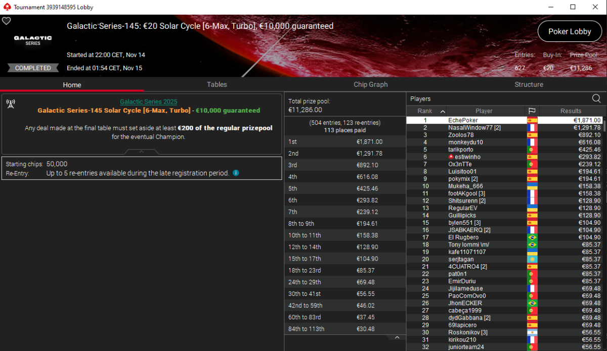 España volvió a dominar la constelación digital de PokerStars con una coordinación casi militar. Y aún queda por resolverse el plato fuerte del domingo: un Shooting Stars de €125 con tres españoles todavía con oxígeno suficiente para aspirar al título.