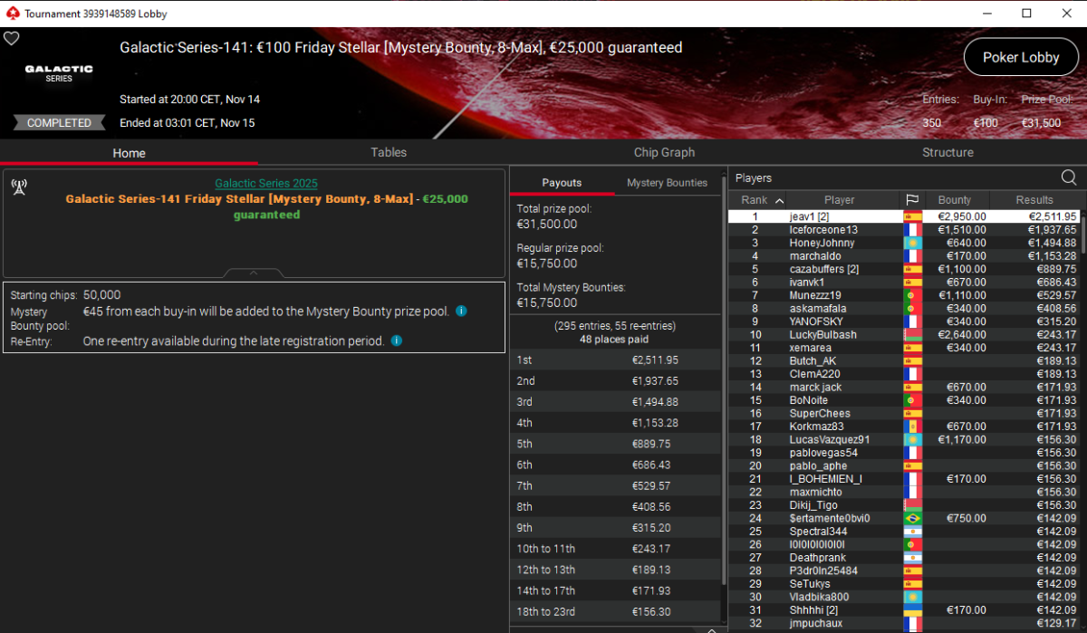 Unas órbitas más abajo, jeav1 desarmó el GS-141 Friday Stellar €100 Mystery para llevarse el premio más grande del fin de semana para La Roja. En total fueron 5.462 €, repartidos en 2.512 € de premio y 2.950 € en bounties, convirtiendo su nave en una máquina de imprimir billetes.