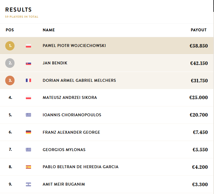 El polaco Pawel Piotr Wojciechowski se llevó el triunfo tras superar un field de 59 jugadores. El título vino acompañado de un premio de 58.850 €, además de su primer brazalete WSOPE.
