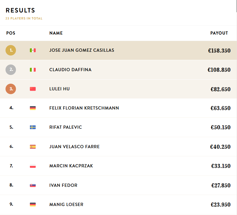 El español fue el gran estandarte de la armada, avanzando hasta la mesa final y asegurándose un premio de 40.250 € junto a un asiento para el Main Event valorado en 10.350 €. Compartió mesa con figuras como Manig Loeser, Rifat Palevic y Felix Kretschmann. La enmienda era complicada, pero la recompensa muy grande, ya que además del dineral que había para el campeón, también podía llevarse el brazalete.