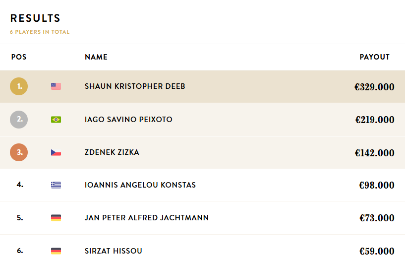 El field fue reducido -apenas 38 jugadores-, pero el premio le sabe a gloria. Especialmente porque en el camino cayó el jugador local Zdenek Zizka, el campeón de backgammon que le birló el brazalete en julio en un heads-up en un evento de 1.000 $. Esta vez, Deeb fue su verdugo y Zizka mordió el polvo en tercera posición por 142.000 €.