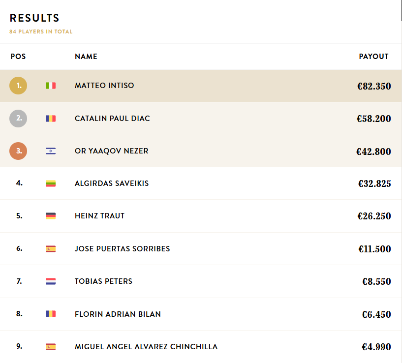 Este último fue el primer eliminado y se llevó 4.990 €, mientras que el castellonense alcanzó la 6ª posición por 11.500 €. José tuvo una mano fatídica ciega contra ciega en la que conectó top pair top kicker y su rival flopeó escalera, lo que le dejó tiritando y no pudo seguir escalando posiciones.