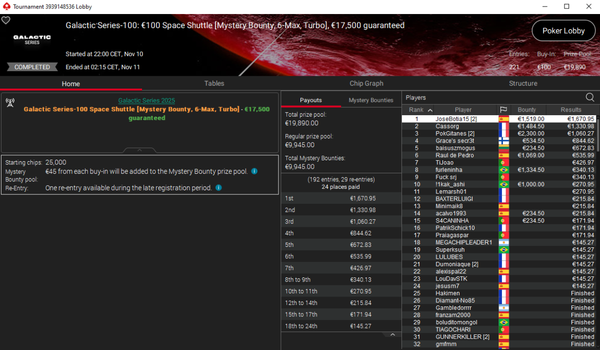 El primero en ondear la bandera española en lo más alto de un podio fue JoseBotia15, campeón del Galactic Series-100: 100 € Space Shuttle [Mystery Bounty, 6-Max, Turbo], un torneo de 221 registros en el que el español dominó con autoridad.