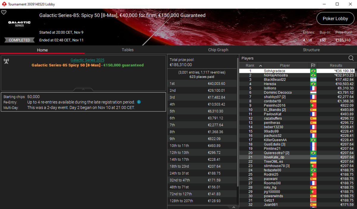 El GS-85: 50 € Spicy 50 [8-Max], que arrancó el domingo y finalizó en la madrugada del lunes al martes, reunió a 4.118 jugadores y un prize pool que se disparó hasta 185.310 €. El campeón, SohAgradece, se llevó 36.190 € tras pactar en el heads-up con su compatriota NoHayAmostra, firmando así el mayor premio de todas las series.