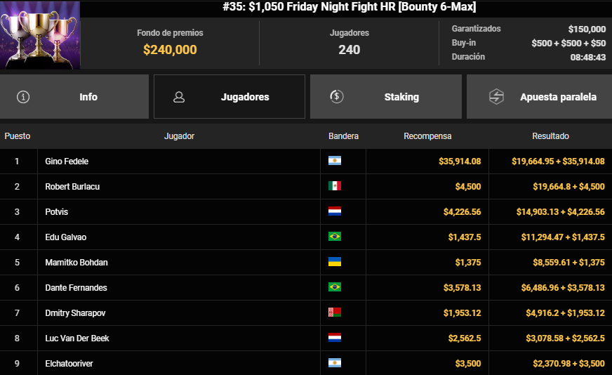Gino Fedele venció en el Evento #35 Friday Night Fight HR Bounty 6-Max, que registró 240 inscripciones de $1K y tuvo un pozo de premios de $240K. Por la victoria obtuvo un premio de $55K, de los cuales $35K fueron por bounties.
