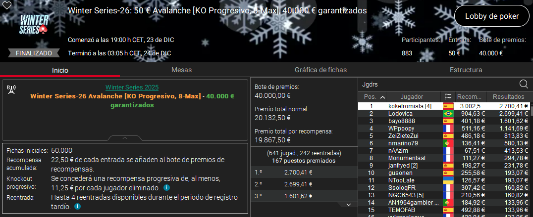 La previa a nochebuena nos dejó 3 victorias españolas en las Winter Series. La más importante vino de manos de Kokefromista que tuvo que sacar la metralleta y disparar 4 balas de 50 € en el Avalanche para hacerse con la victoria.