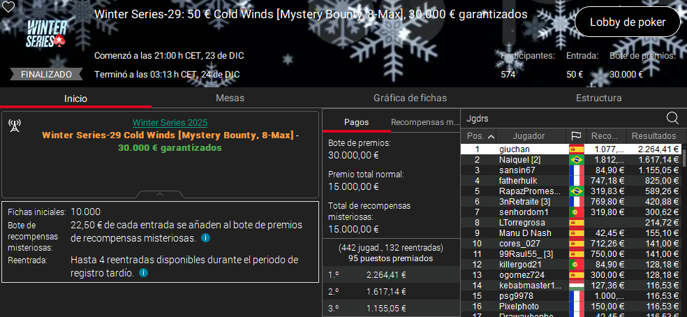 A esta victoria hay que sumar la que consiguió Giuchan. El Cold Winds de 50 € de entrada tuvo un total de 574 registros y los 30.000 € de la bolsa de premios quedaron repartidos entre los primeros 95 clasificados.