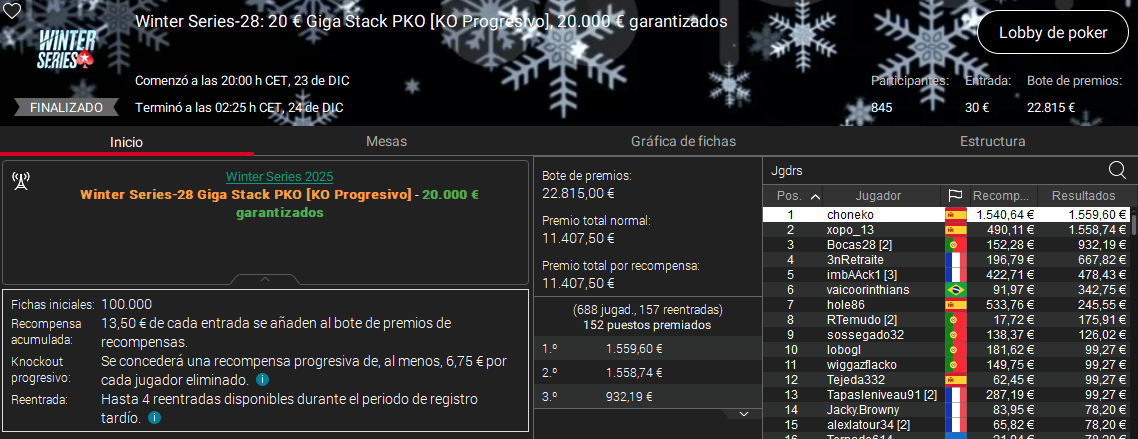 Completando el tridente de victorias tenemos a choneko, que solo necesitó una bala, igual que Giuchan, para imponer su ley en el Giga Stack PKO. Un torneo de 845 registros en el que dos españoles llegaron al HU.