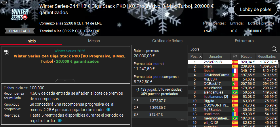 Ayer las Winter Series tuvieron un claro protagonista y ese fue 2ASeRiouS. El español se quedó muy cerca de firmar un doblete en la msma jornada, pero el jugador húngaro OneChougDoug impidió su victoria en el Giga Stack Pro de 50 € de entrada.