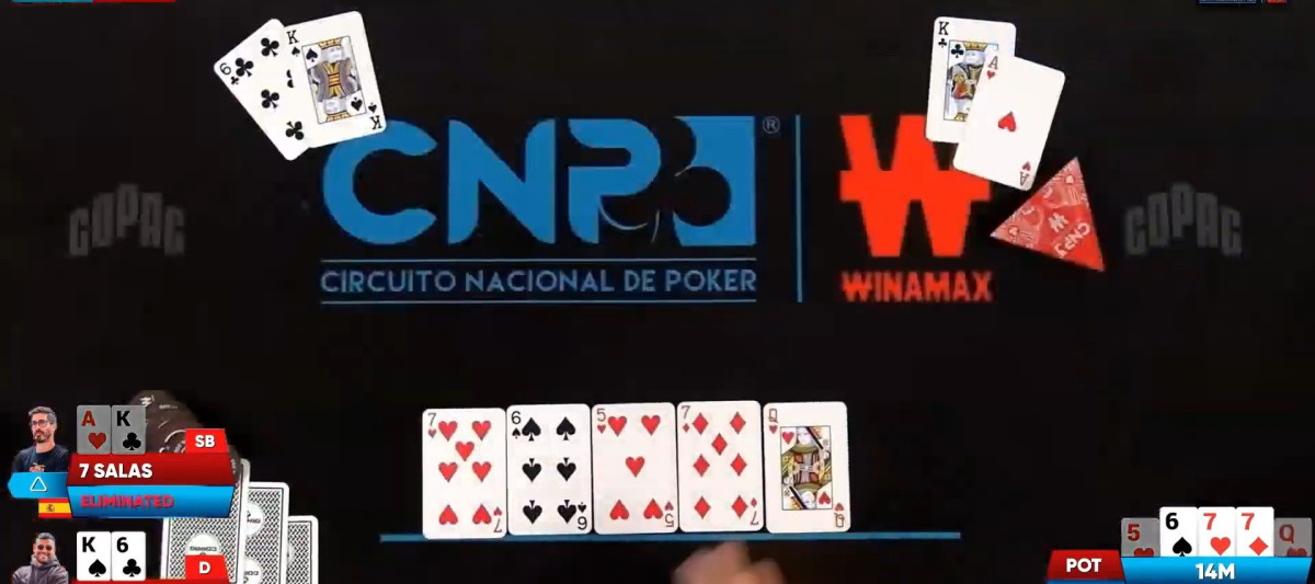 Un flop 7h6s5h hizo cambiar drásticamente les equitys e hizo favorito a Omar, que certificaba la eliminación de Sala gracias a otro 7d en turn y a la Qh del river.