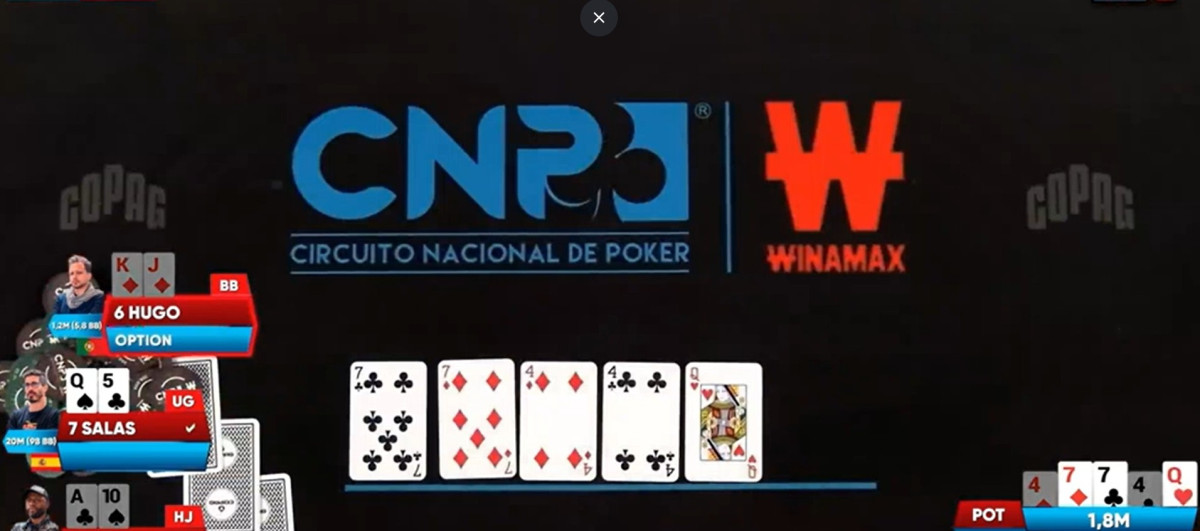 Dominaba Manuel, pero el flop era un suplicio con dos diamantes que le daban el proyecto de color a Hugo. El luso y Salazar checkearon hasta el river, donde llegaba una dama que hacía saltar por los ases a Manuel y le daba el bote al de Chinchón, que sigue distanciándose de sus rivales cada vez más.