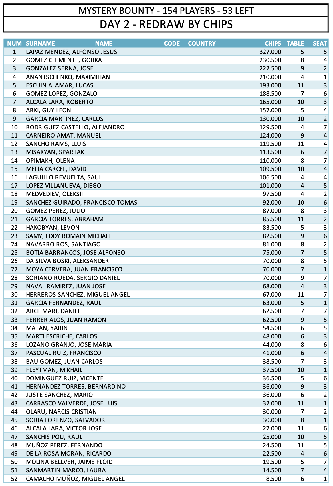 La dirección del torneo tomó la decisión de parar el reloj a falta de 18 jugadores, entre los que también se encuentra Adrián Nicolae, inmediato perseguidor de Aspas. Su conteo total ronda los 2,3 millones de puntos, una cantidad más que suficiente para plantar cara a Aspas, ya que estarán en la misma mesa. Cosas del destino.
