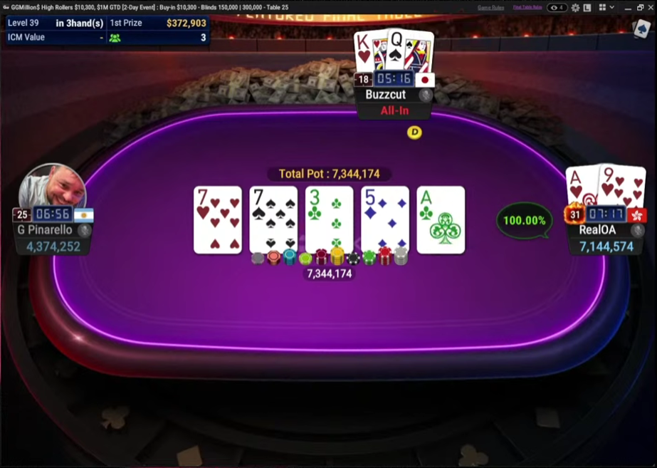 Con los tres últimos jugadores en pie llegó la mano que dio paso al heads up. "Buzzcut" osó a enfrentarse a "RealOA" y este le explicó por qué no debía haberlo hecho. Con esta última baja, el hongkonés llegó al cara a cara con una ventaja de 3.5 a 1 que sería definitiva.