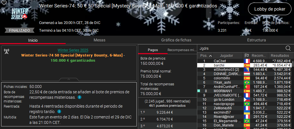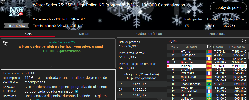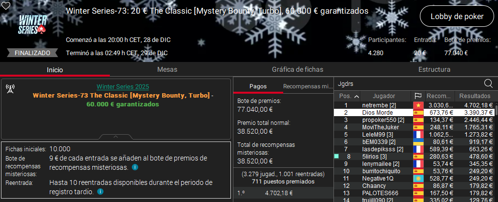 A estos resultados hay que sumar los runner ups de Lordnaipes en el 30 € Royal Rumble, el de wisukk en el 50 € Avalanche y el de Dios Morde en el The Classic.