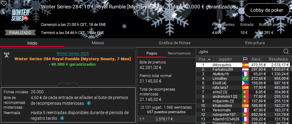 A estas dos victorias hay que sumar las que consiguieron Oumist en el 30 € Bounty Freeze y ¡¡Mosquito¡¡ en el 10 € Royal Rumble.