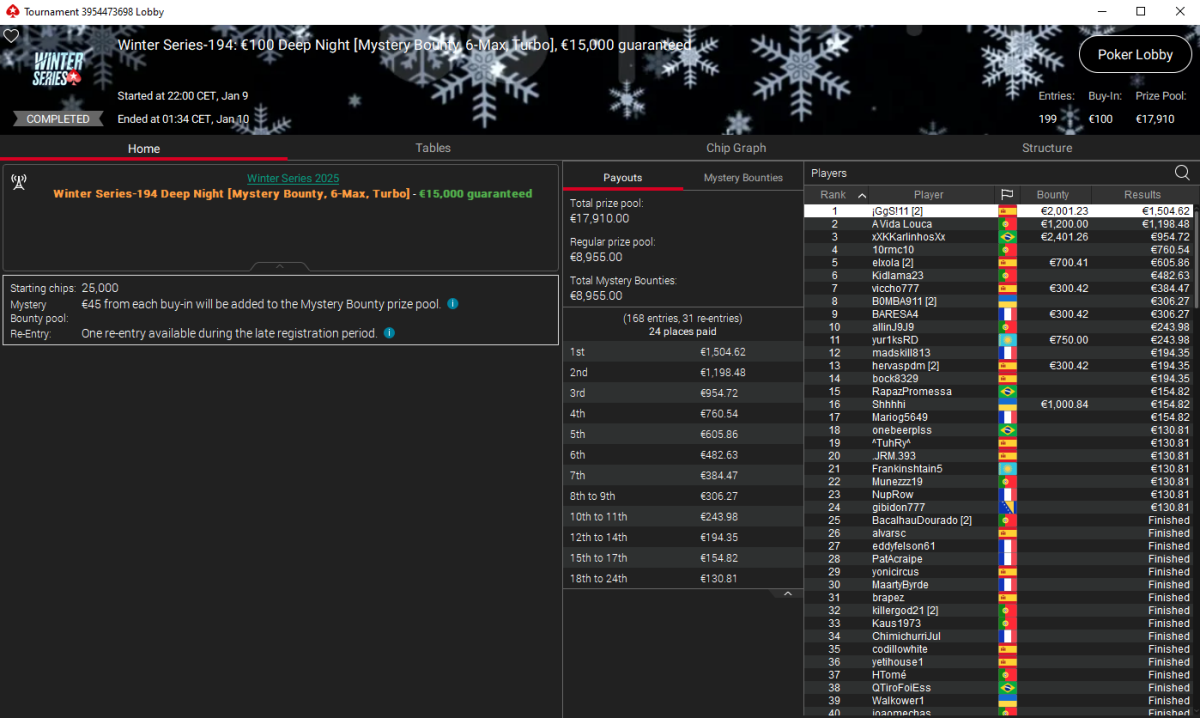 El cuarto oro lo firmó ¡GgS!11 en el Winter Series-194: €100 Deep Night (Mystery Bounty 6-Max Turbo). Con 199 entradas y un prize pool de €17.910, el español ascendió hasta la cima y se llevó 1.505 € de premio y un buen pellizco extra en sobres misterios: 2.001 €. Un título que además le deja los bolsillos llenos.