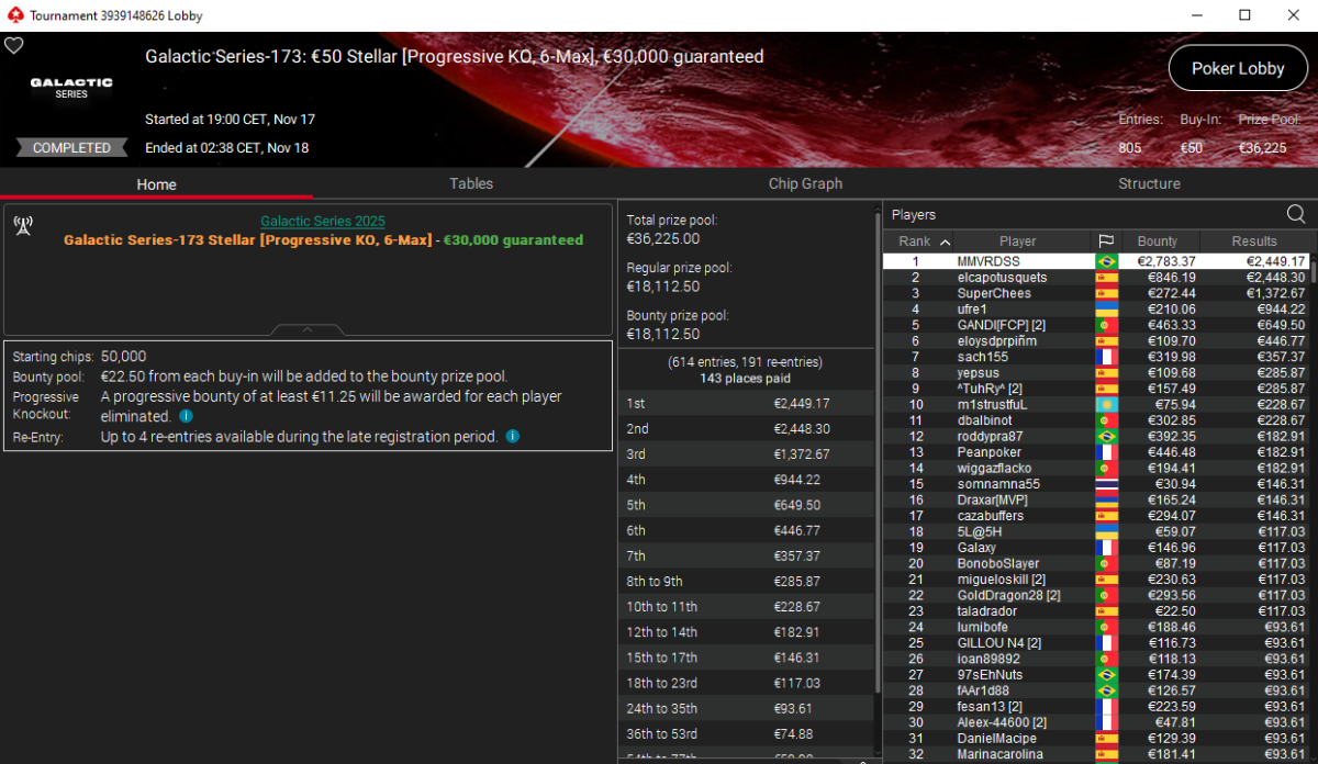 Chaancy fue el único capaz de salvar honor español. Tras varios intentos fallidos por parte de otros tripulantes de la armada, fue Chaancy quien conquistó el GS-179 Bounty Planet de €10. El torneo se fue hasta 2.088 registros totales y nuestro compatriota aterrizó en el primer puesto con un premio 1.137 € más 901 € en bounties para un total de 2.039 €.
