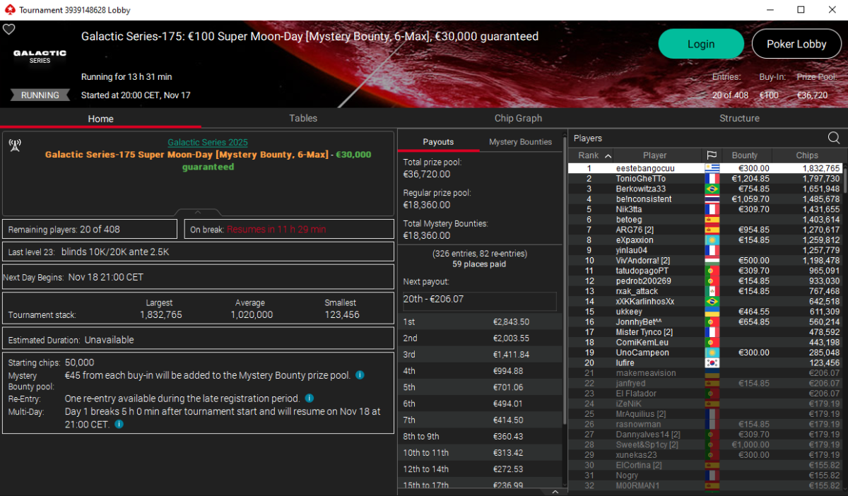 También queda hoy por resolver el Super Moon-Day de €100, con 20 jugadores vivos de 408 entradas. La carrera lunar continúa, y ahí siguen otros dos españoles maniobrando en la oscuridad:
