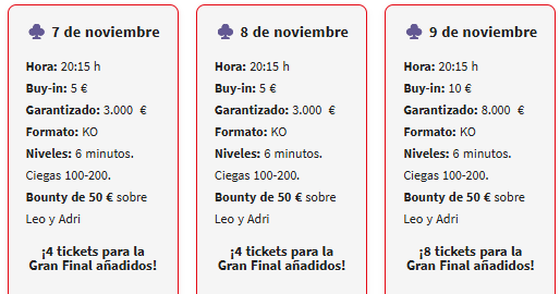 Del 7 al 9 de noviembre a las 20:15h cada día, los jugadores podrán enfrentarse directamente a Adrián Mateos y Leo Margets en mesas con formato KO progresivo y buy-ins de 5 € y 10 € y un garantizado de 3.000 € y 8.000 € respectivamente.