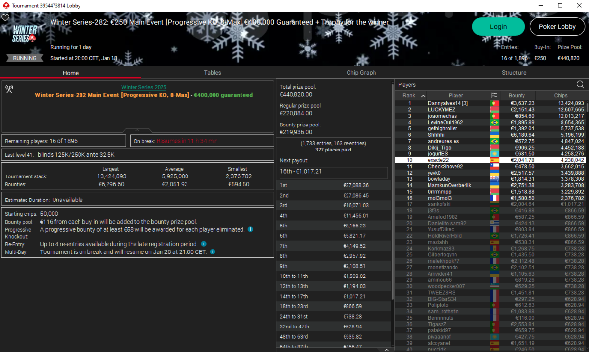 En el Winter Series-282: 250 € Main Event [Progressive KO, 8-Max] se registraron 1.896 entradas y el prize pool se fue hasta 440.820 €, superando holgadamente el garantizado que propuso la sala de la pica roja.