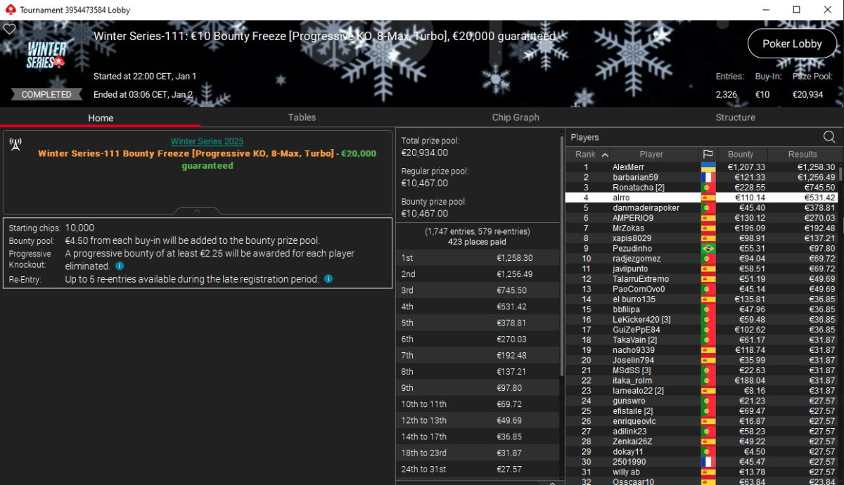 También subieron al podio KOLYSO, segundo en el Winter Series-102 Confetti (€10 PKO) con un cobro total de 2.115 € y toniibissa, tercero en el Winter Series-103 Cold Winds (€30 PKO), donde sumó 967 € en total tras una mesa final muy disputada.