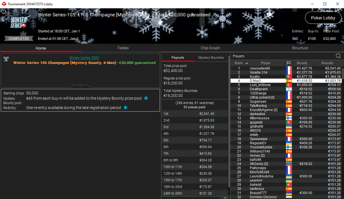 La lista de resultados destacados se completa con varios puestos de mérito. zsayd fue tercero en el Winter Series-109 Royal Rumble por 1.423 € en total, mientras que D.frizx3 acabó cuarto en el Winter Series-105 Champagne (€100 Mystery Bounty) llevándose 2.040 entre premio y sobres.
