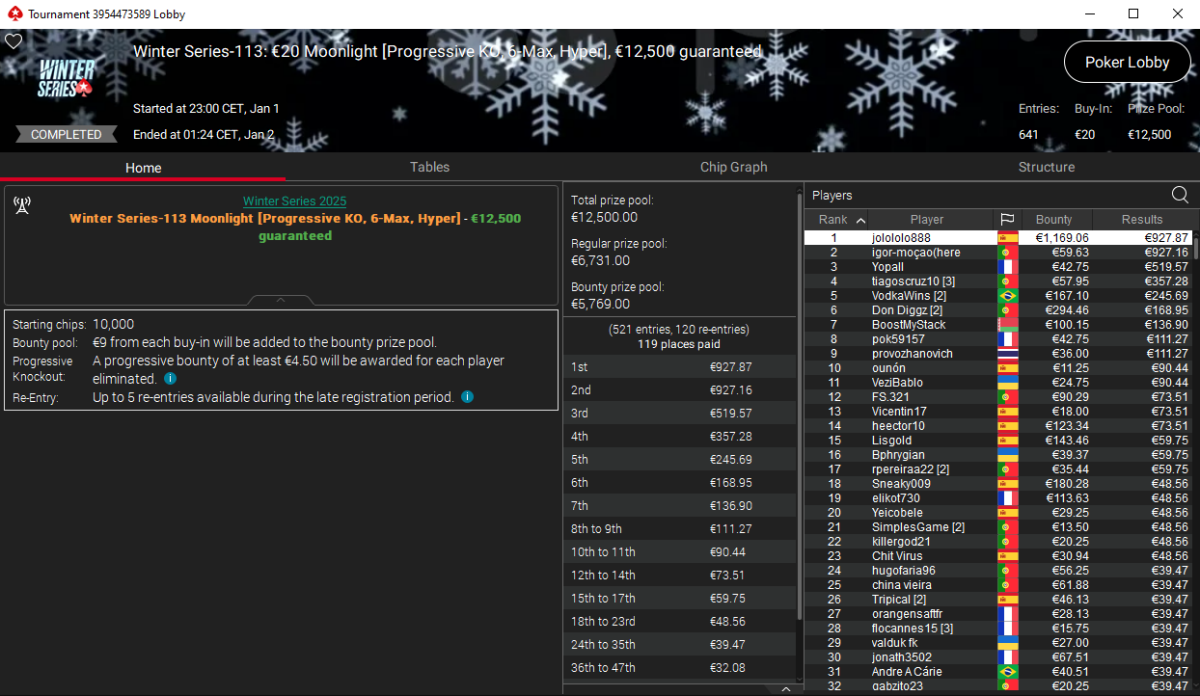 El segundo título llegó en el Winter Series-113 Moonlight (€20 Progressive KO, Hyper), donde jolololo888 fue el mejor de 641 jugadores para levantar el trofeo y sumar 2.097 € entre premio y bounties. Un triunfo rápido y perfecto para cerrar la sesión con otra bandera española en lo más alto del lobby.